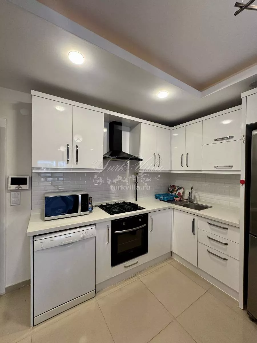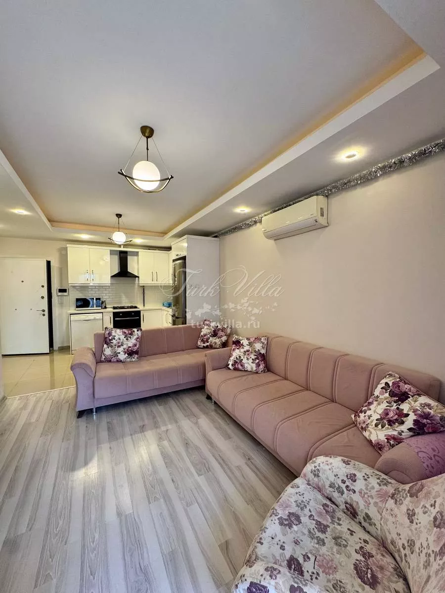 Планировка включает светлую гостиную с кухней открытого типа, одну спальню, санузел и балкон. Из окон открывается приятный вид на горы. В каждой комнате установлены кондиционеры, а также предусмотрено газовое отопление, что делает квартиру комфортной для круглогодичного проживания.