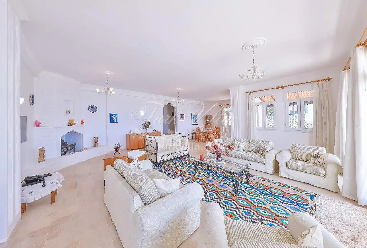 Гостиная: вид на море и природу, мебель для отдыха, спутниковое телевидение (ЖК), беспроводной интернет, кондиционер, обеденный стол на 6 человек, выход на террасу у бассейна.