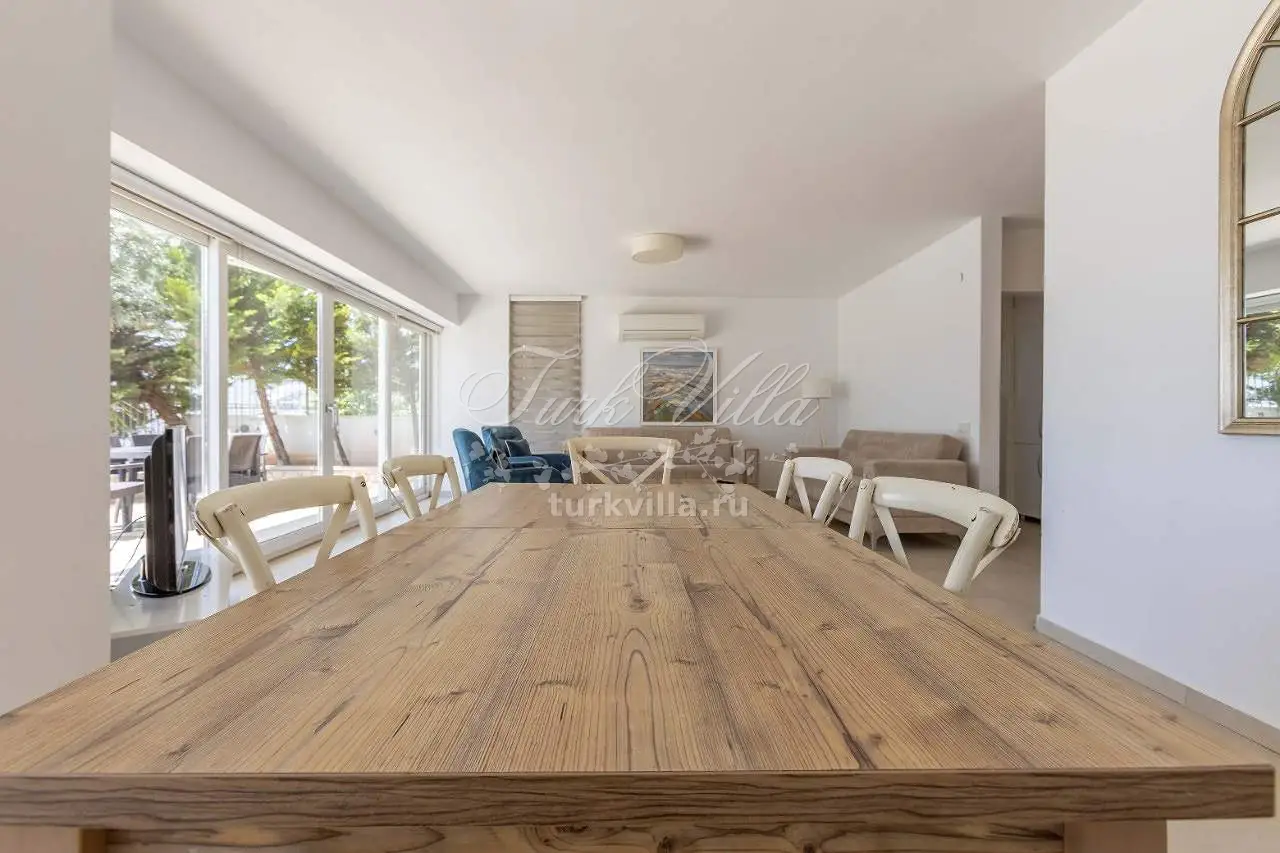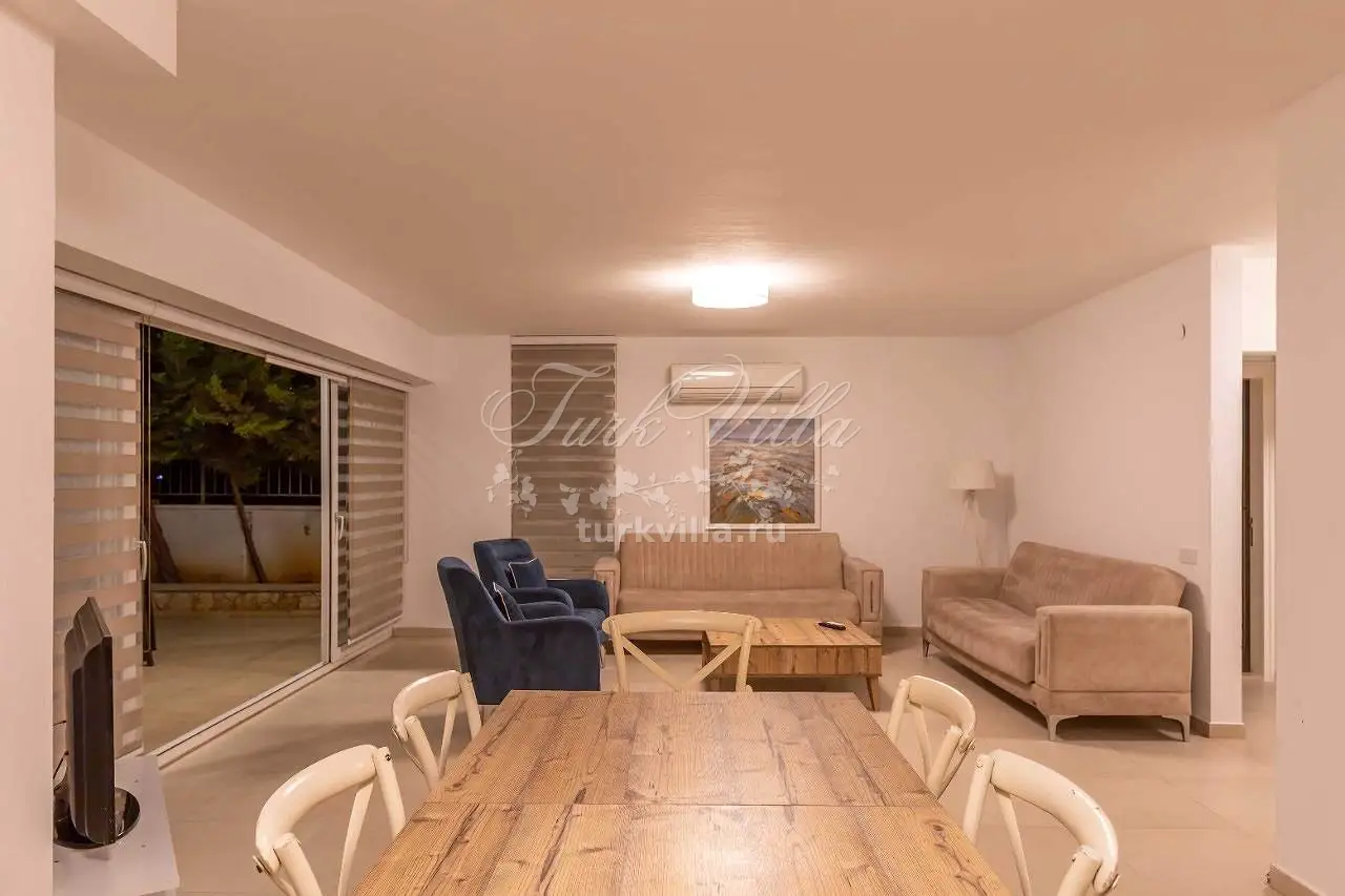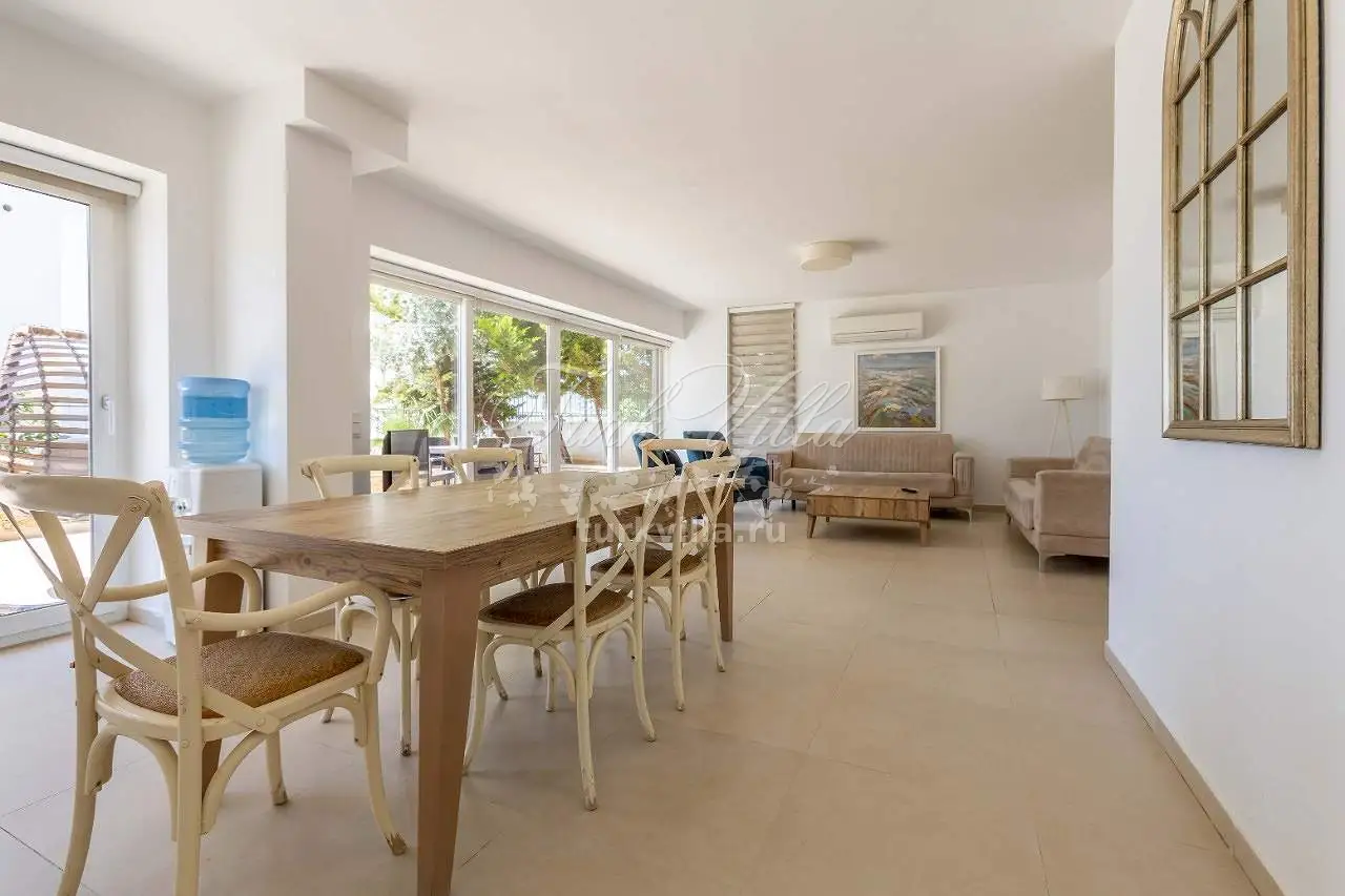 Гостиная: зона для отдыха с видом на море, ЖК-телевизор, обеденный стол на 6 человек, выход к бассейну, санузел.