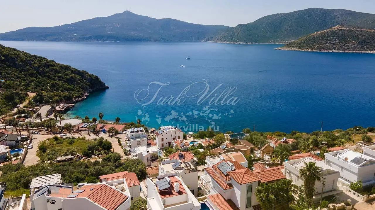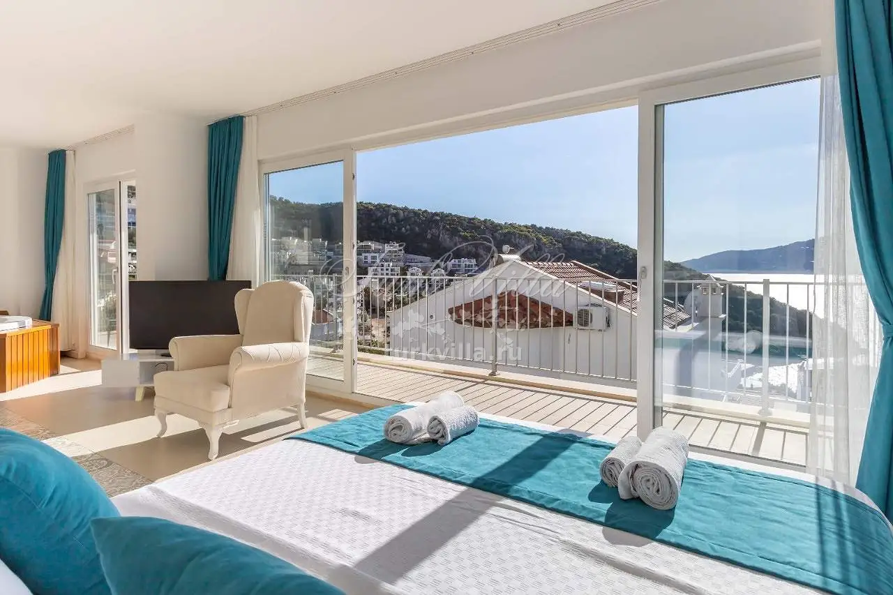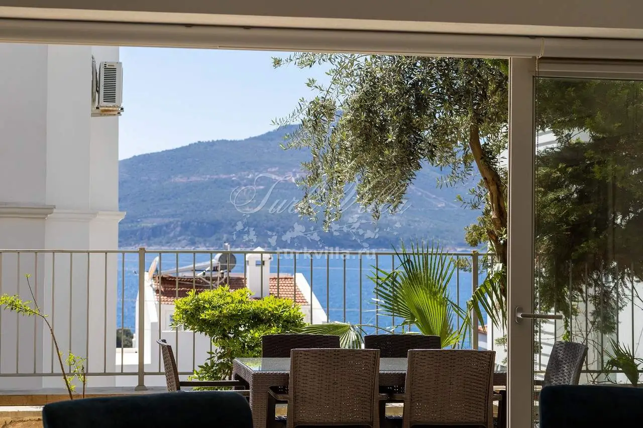 Гостиная: зона для отдыха с видом на море, ЖК-телевизор, обеденный стол на 6 человек, выход к бассейну, санузел.