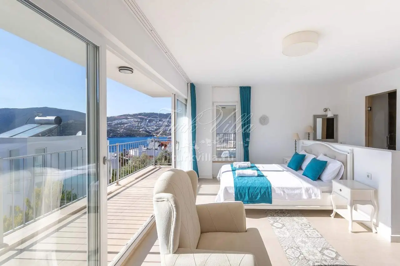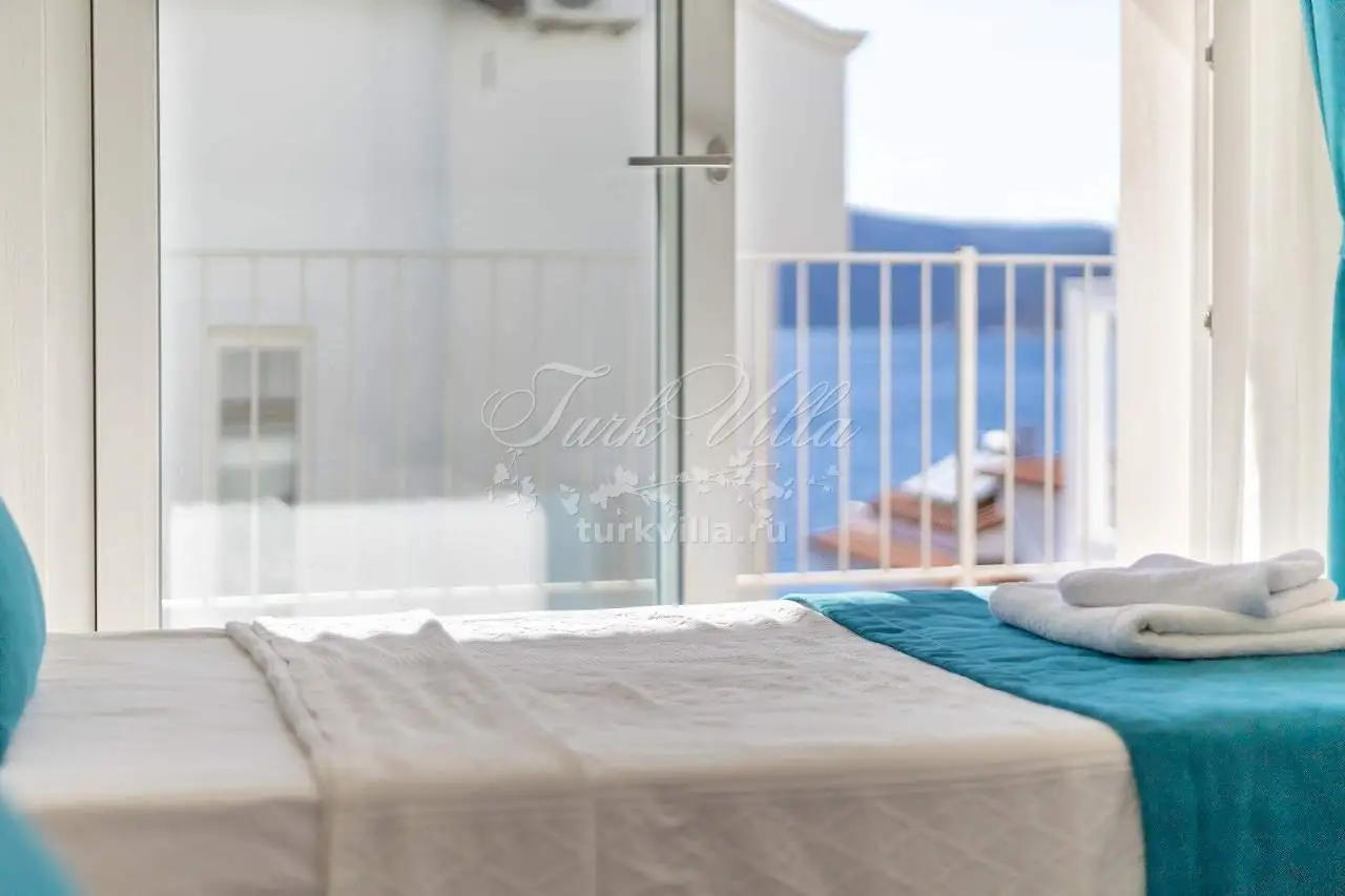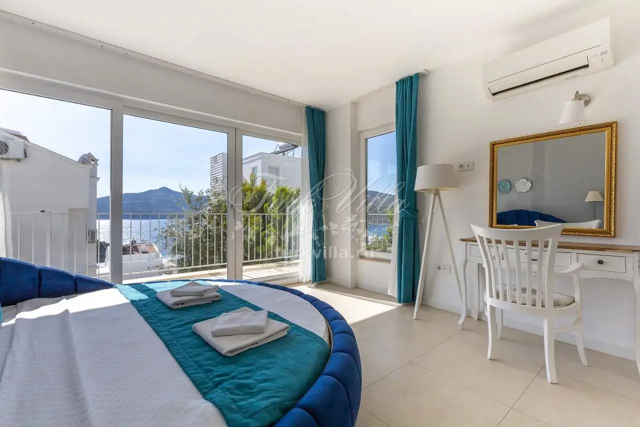 Спальня 3 - двуспальная кровать, тумбочка, кондиционер, туалетный столик, санузел, балкон с видом на море.