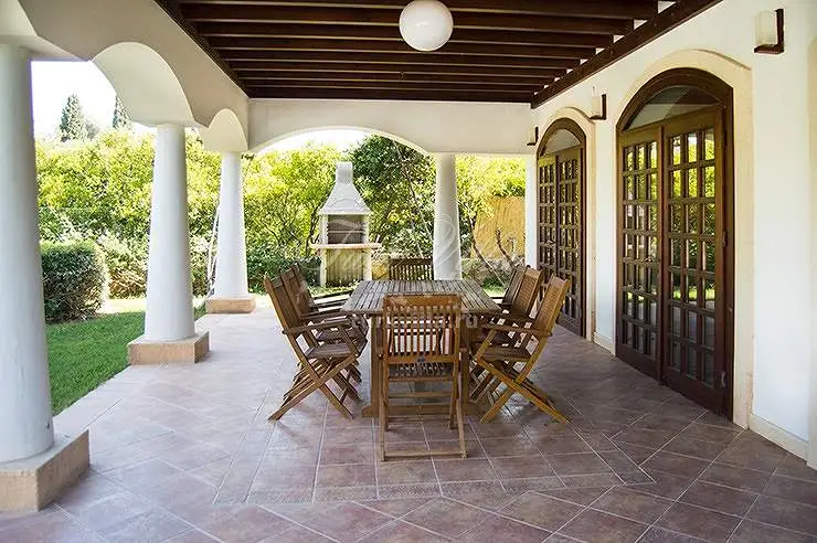 Частный сад, частный бассейн, зона для загара, шезлонги, зонтики, обеденный стол, барбекю.