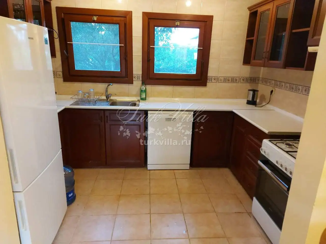 Кухня: большая и современная кухня, холодильник, посудомоечная машина, стиральная машина, обеденный стол на всю семью, посуда на 6 человек.