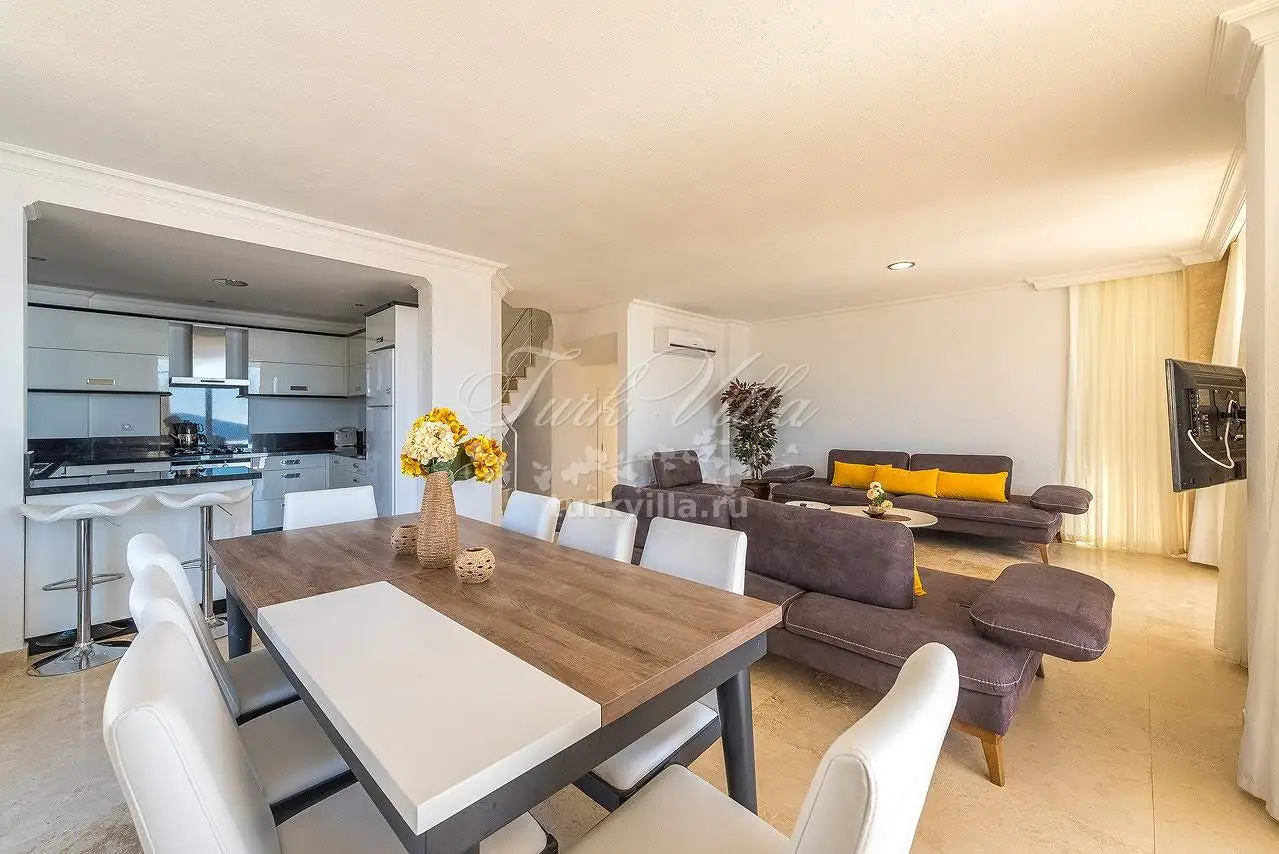 Гостиная: мебель для отдыха, спутниковое телевидение (ЖК), беспроводной доступ в Интернет, кондиционер, обеденный стол на 10 человек, выход на террасу у бассейна.