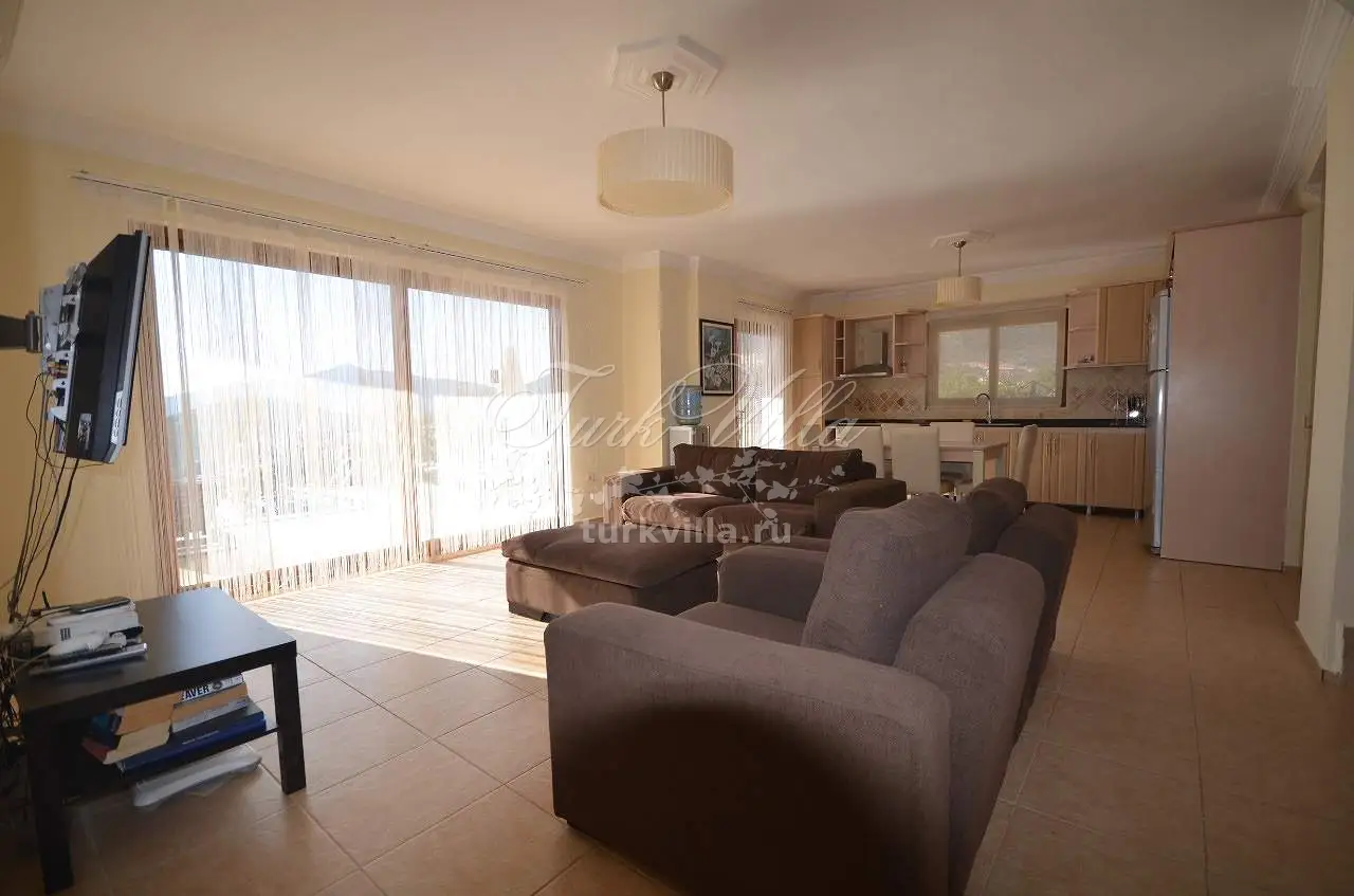 Гостиная: вид на море и природу, мебель для отдыха, спутниковое телевидение (ЖК-экран), беспроводной Интернет, кондиционер, обеденный стол на 6 человек, выход на террасу у бассейна.