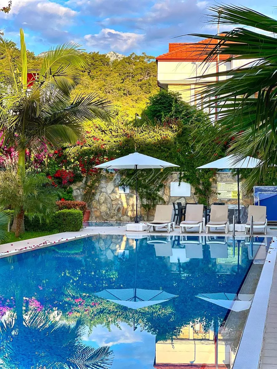 Закрытая территория комплекса оснащена бассейном и обеспечивает приватность, безопасность и атмосферу курортного отдыха.