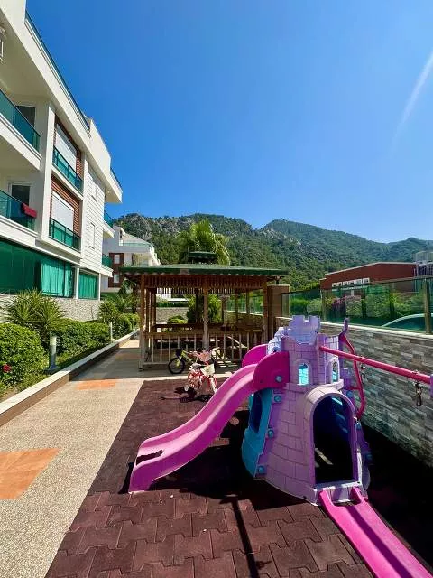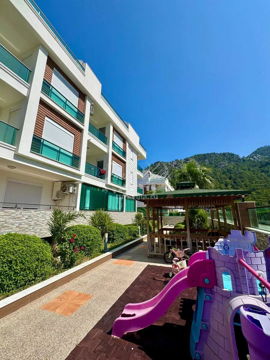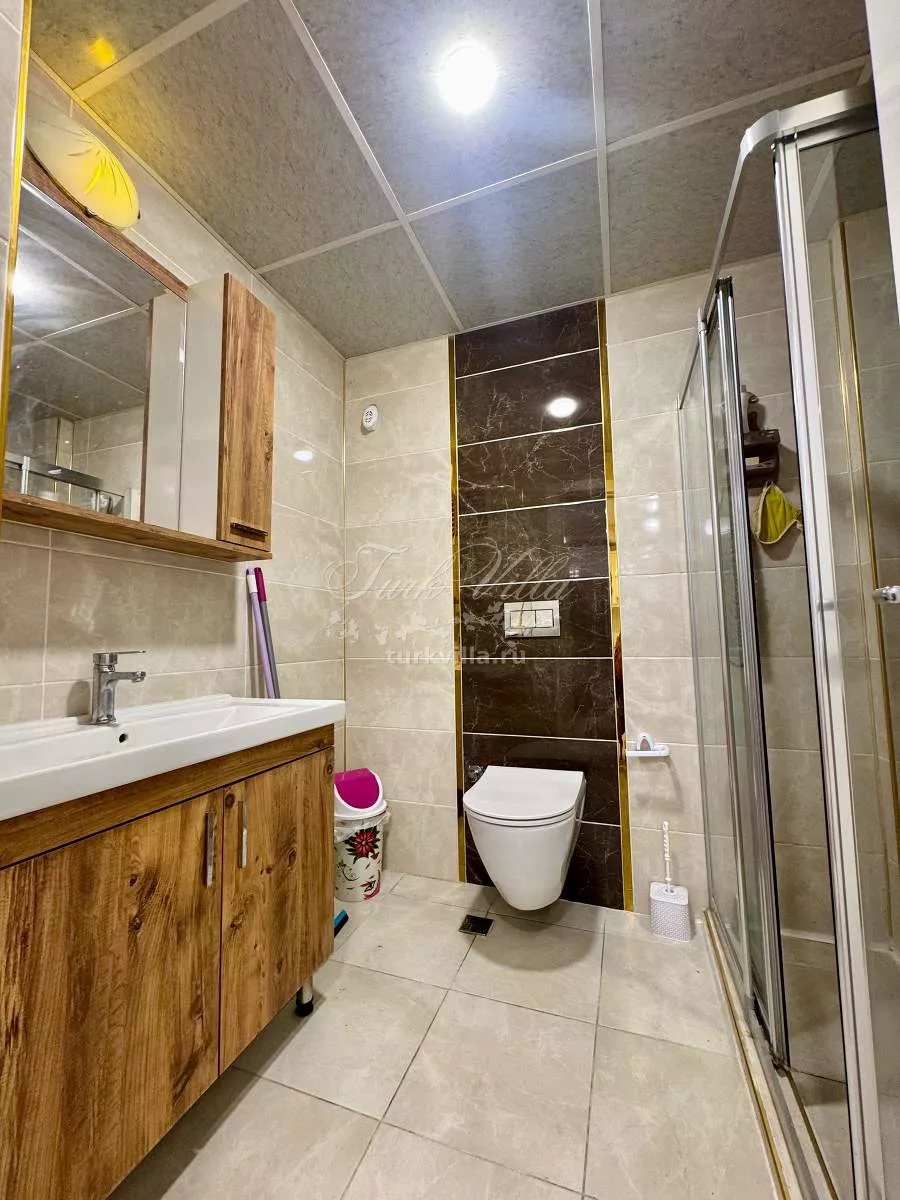 Планировка включает светлую гостиную с кухней открытого типа, одну спальню, санузел и балкон. Из окон открывается приятный вид на горы. В каждой комнате установлены кондиционеры, а также предусмотрено газовое отопление, что делает квартиру комфортной для круглогодичного проживания.